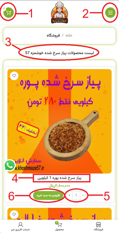 گزینه 5: مقدار نشان داده شده اولیه که همان عدد 1 هست یعنی همان (1کیلو) میباشد،چنان که قصد اضافه کردن یا کاستن از مقدار سفارش خود را دارید میتوانید با گزینه های کناری آن این مقدار را افزایش یا کاهش دهید.
