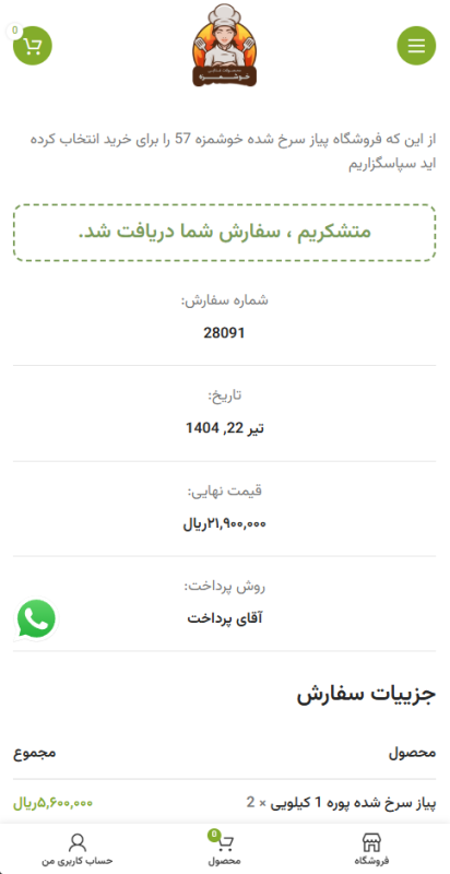 بعد از این  که سفارش شما به درستی ثبت شد برای شما این صفحه نمایش داده خواهد شد که در آن شماره سفارش درج شده که همچنین از طریق سامانه پیامکی برای شما اطلاع رسانی خواهد شد.